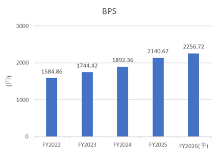 また、BPSは年々積みあがっており、足元では株価をも下回る水準で推移しています。