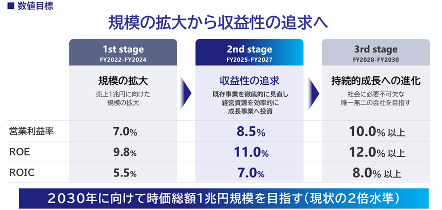 同社は収益性の向上を経営目標に掲げており、営業利益率をと段階的に引き上げ、2030年に時価総額1兆円規模を目指す方針です。