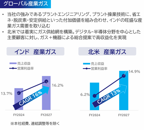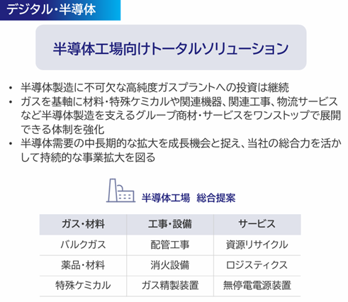 また、半導体工場向けのトータルソリューション事業、インドや北米を含むグローバル産業ガス事業の強化を進めています。
