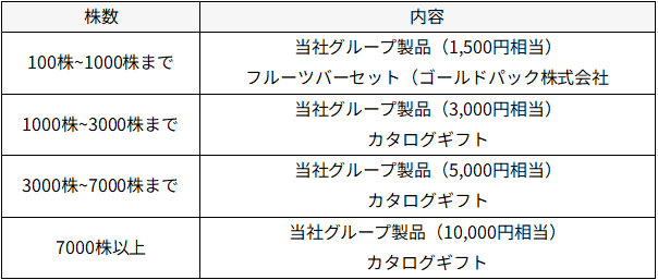100株以上の保有で、株数に応じた株主優待を受けることができます。