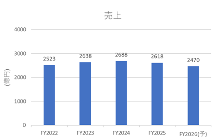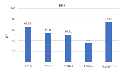 近年の売上高は横ばいからやや縮小傾向にあります。一方でEPSは直近年度において大きく改善していますが、長期的に見ると明確な右肩上がりとは言い切れません。