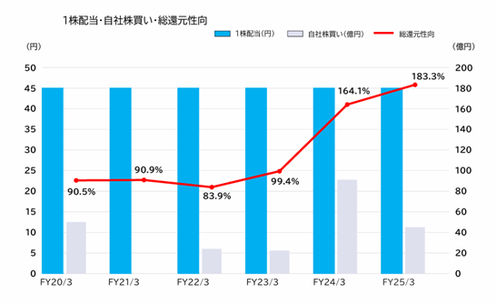 配当利回りは3%近くと比較的良好な水準ですが、配当性向は60%以上を掲げているものの、すでに80%前後で推移していることから、今後は利益成長を伴わない限り大幅な増配は見込みにくい状況と考えられます。