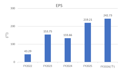 コロナ禍以降で業績は大幅に低迷しましたが、2025年からはEPSが回復基調にあります。ただし、ROAは2%台にとどまっており、資本効率性が高いとは言い難い状況です。