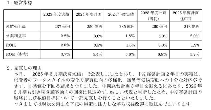 中長期計画が下方修正されていることから、足元の業績は堅調とは言い難い状況です。