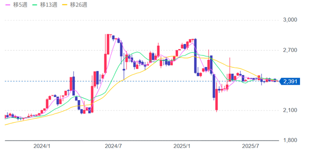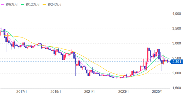 長期チャートでみると、コロナ禍の暴落以前から業績低迷に伴い、大きな下降トレンドを描いていました。しかし、直近数年では底打ち感が見られ、堅調に推移しています。今後、リブランディングの効果を活かし、成長ストーリーを描けるかが注目されます。