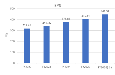 主力の賃貸セグメントが業績を牽引しており、全体として増収増益傾向を維持しています。近年は売上高の伸びは緩やかですが、EPSは右肩上がりで推移しています。