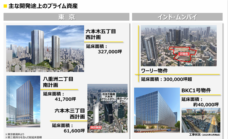 同社は今後10年以内に経常利益4,000億円を目標に掲げています。現時点で3,000億円に到達しており、今後は東京に加え、インド・ムンバイへの積極投資を進める方針です。希少性の高いプライム資産を積み上げる一方で、プライム以外の資産については見直しを進めています。