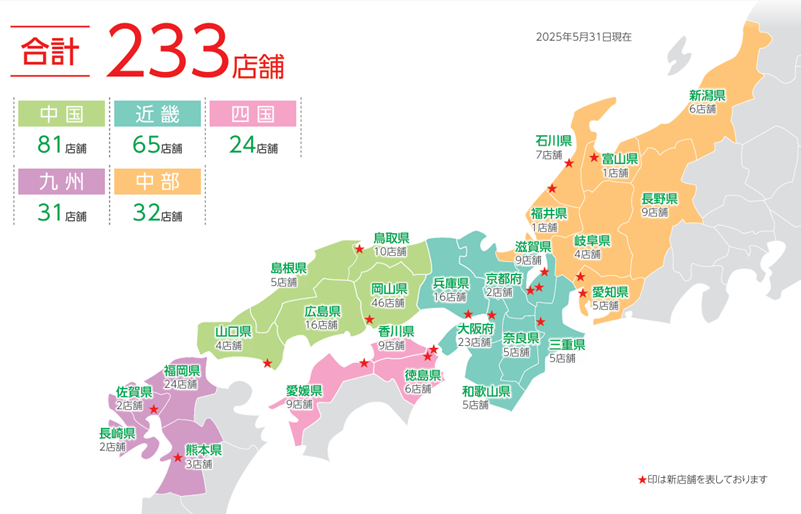 店舗網は西日本を中心に拡大しており、2025年5月時点で約230店舗を展開しています。全国展開を見据え、「2035年に700店舗出店」という目標を掲げており、今後は中部地方や関東地方への進出も視野に入れています。