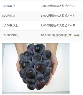 株主優待として、岡山県名産の大粒ピオーネが保有株数に応じて進呈されます。