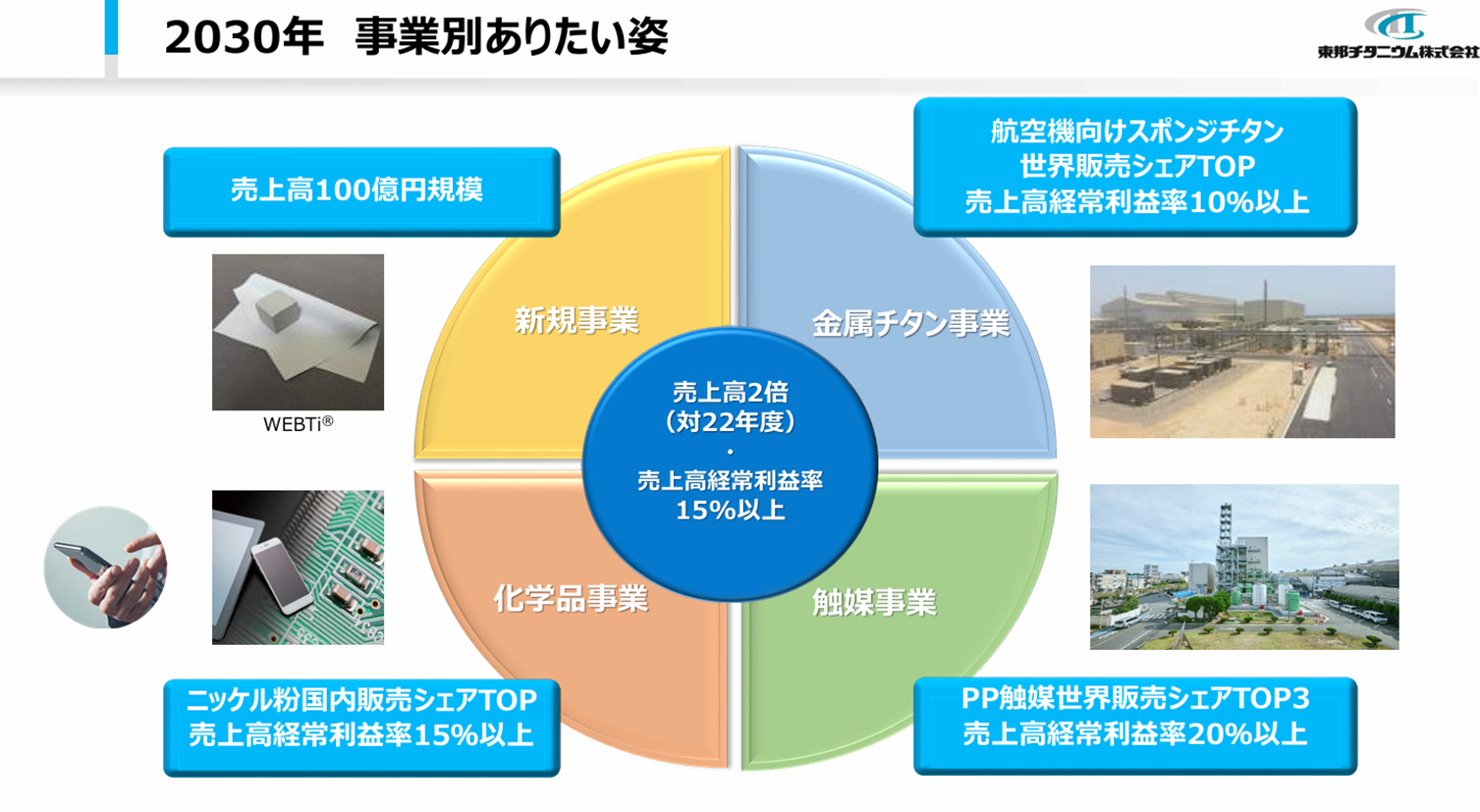 また、航空機向けスポンジチタンの世界シェアにおいても、現時点では世界第3位のポジションですが2030年度までに首位を目指しています。
